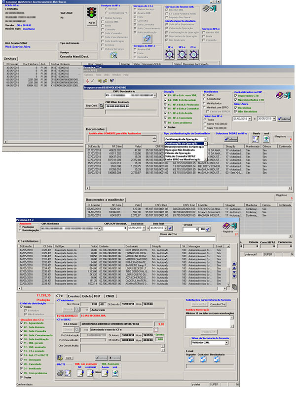 Distribuição de documentos fiscais (Download de Documentos eletrônicos, XML das NF-e e dos CT-e. Manifestação dos documentos, Ciência da operação, Operação Realizada, Desconhecimento da Operação, Operação não Realizada).
